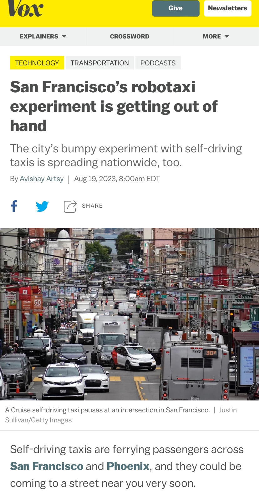 In a podcast interview between Vox host Sean Rameswaram and Liz Lindqwister, a data journalist at the nonprofit news startup the San Francisco Standard, it is explained that because of flexible pricing schemes, people are frequently taking robotaxis just to ride around town and hang out and do – I love the word – debaucherous things. What can be more American than people using robotaxis to have sex in the backseat. The problem is, however, that any complicated traffic situation makes these robotaxis completely freeze and block traffic.