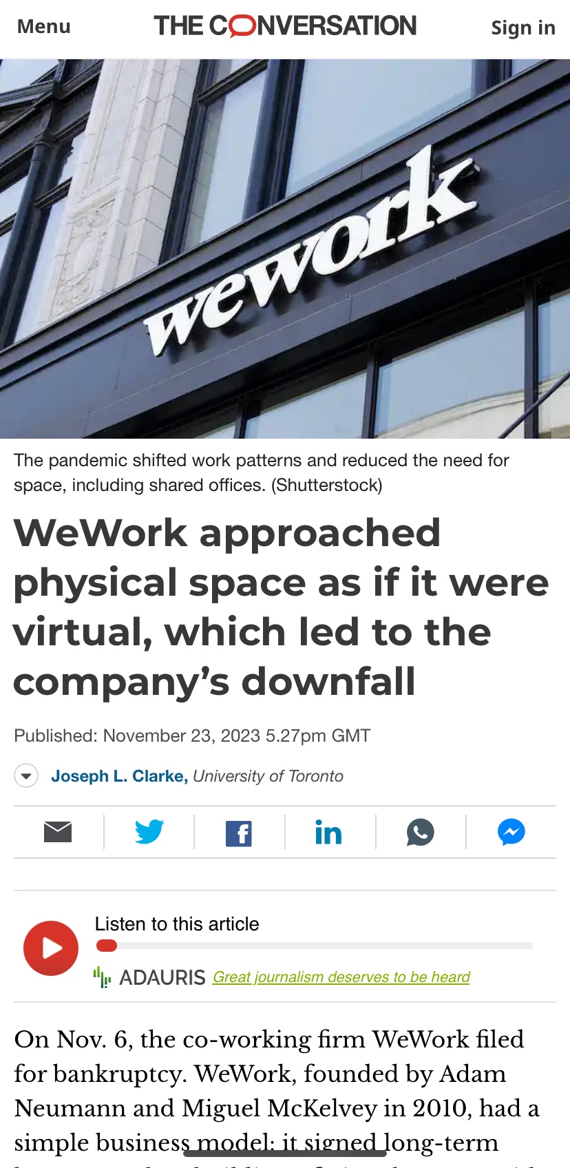 The Conversation has an interesting piece called “WeWork approached physical space as if it were virtual, which led to the company’s downfall”. In the article, the author argues that dreams of cities as cybernetic systems – while old – have their limits.
