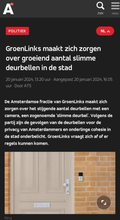 Dutch local news channel for Amsterdam AT5 reports that GroenLinks, a Dutch leftwing green party, is worried about the rampant use of smart doorbells like Ring.