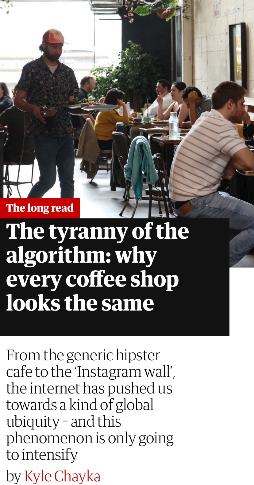 The author, who just had a new book out called “Filterworld: How Algorithms Flattened Culture” , takes a closer look at the “hipster coffee shop” that looks basically the same in every city in the world. For one type of audience this feels very welcoming and familiar whole for others these global ‘spaces of flow’ as Castells called them are exclusionary. Quote: