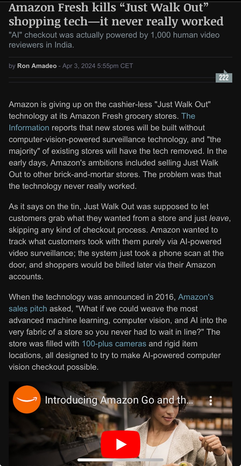 Ars refers to reporting by The Information (paywall) that suggest Amazom was not able to properly train the machine vision AI they should detect what items people are grabbing from the shelves. The report said that “Amazon had more than 1,000 people in India working on Just Walk Out as of mid-2022 whose jobs included manually reviewing transactions and labeling images from videos to train Just Walk Out’s machine learning model.” And: “As of mid-2022, Just Walk Out required about 700 human reviews per 1,000 sales”, which never made it a viable technology.
